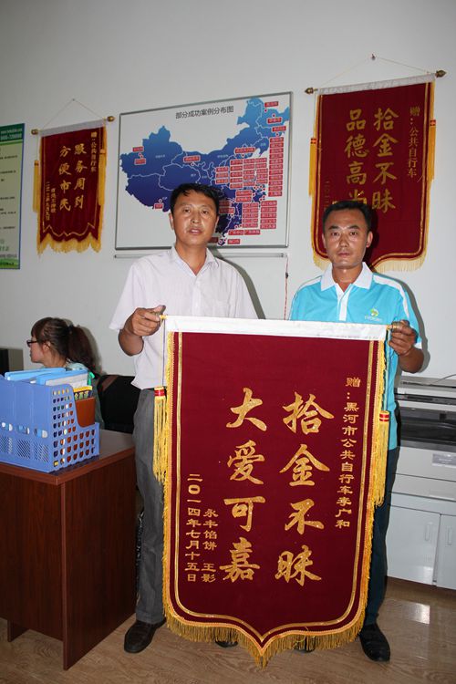 7月15日上午,黑河鐵路街永豐餡餅店老板韓志富不顧天氣炎熱,拿著一面寫有“拾金不昧,大愛可嘉”的錦旗,來到黑河市公共自行車管理中心,一進(jìn)門就找員工李廣和,“太感謝他了,要不我媳婦的錢卡肯定找不回來了?!?br/>7月7日下午4點(diǎn)多鐘,韓志富和妻子王影騎公共自行車一同到原西市場附近。在站點(diǎn)還車后,王影把錢包落在了車筐里,10多分鐘之后才察覺,夫妻倆頓時(shí)驚出一身冷汗,錢包里有身份證、銀行卡及現(xiàn)金2400多元,“這么多錢丟了,肯定找不回來了。”夫妻倆向派出所報(bào)了案,民警建議夫妻倆向公共自行車管理中心打電話查詢一下,看有沒有人撿到。夫妻倆幾乎不抱什么希望地?fù)艽蛄穗娫?,聽到的消息卻讓他們欣喜若狂,“什么,錢包讓自行車巡檢員撿到了?”