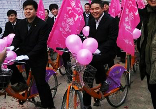1月16日早上8時,一行由30名帥小伙組成的公共自行車迎親隊伍,出現(xiàn)在永城市東城區(qū)文化路東側(cè)的聯(lián)社家屬院內(nèi)。他們是前來迎娶在民政局工作的新娘時娜的。