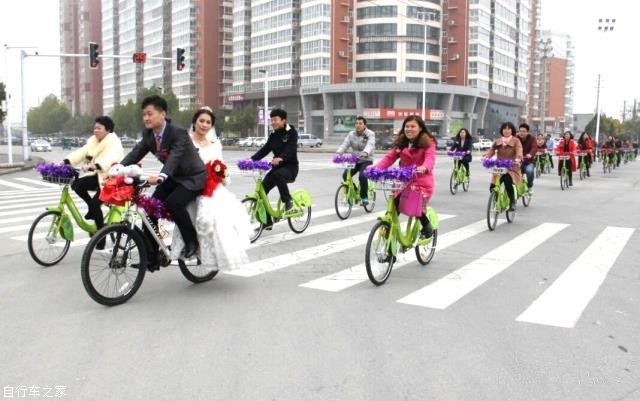 用公共自行車代替?zhèn)鹘y(tǒng)婚車,沒有豪車,沒有奢華的場(chǎng)面,但親友團(tuán)們組成的自行車陣,也賺足了市民的眼球,贏得百分百的回頭率。在高檔婚車“熱”的當(dāng)下,低碳、環(huán)保的公共自行車迎親隊(duì)伍猶如雨后一抹新綠,讓人眼前一亮。這種浪漫的結(jié)婚方式讓婚禮變得更有意義。
