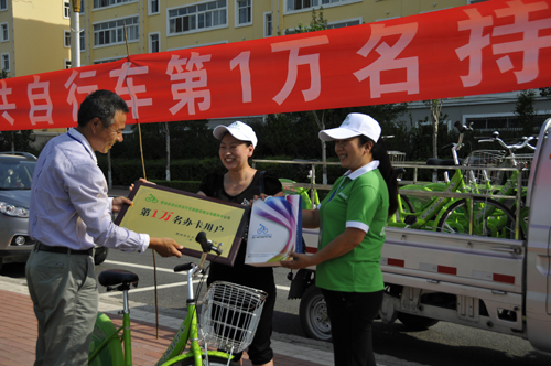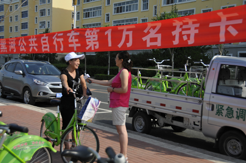 黑河公共自行車自2012年5月27日投入使用以來,受到廣大市民的愛護(hù)和歡迎,平均每天日均使用量日日攀升,截止至7月31日,黑河公共自行車辦卡用戶突破10000張,第10000名辦卡用戶高艷萍女士成為幸運(yùn)用戶,并獲得自行車管理中心送出的紀(jì)念品.