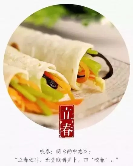 “立春”這一天,中國民間習(xí)慣吃蘿卜、姜、蔥、面餅,稱為“咬春”。最早的記載顯示咬春吃春餅。民間在立春這一天要吃一些春天的新鮮蔬菜,既為防病,又有迎接新春的意味。