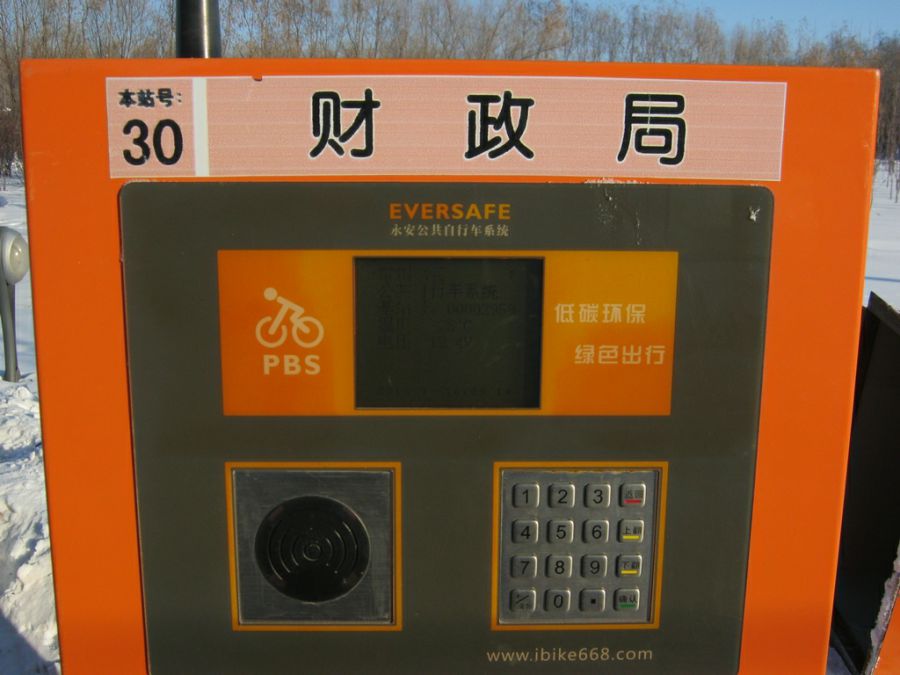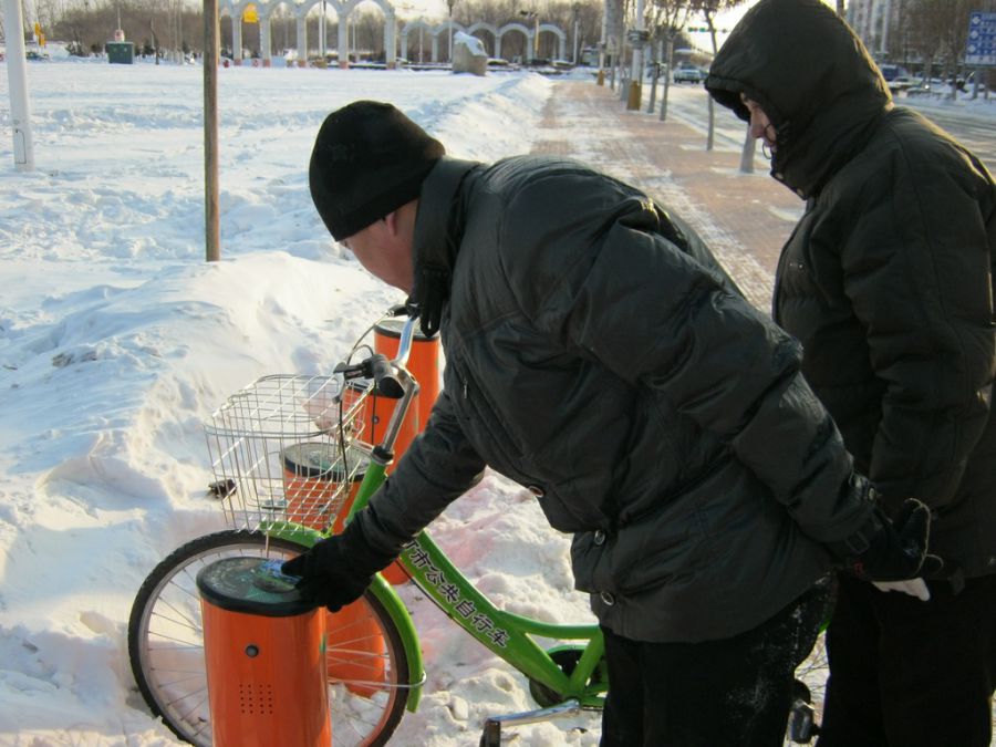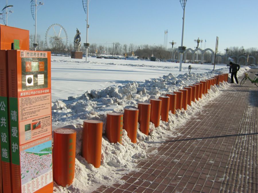 2013年1月16日至19日,黑河市公共自行車管理中心工作人員在氣溫零下20℃—30℃時,對世紀廣場、財政局、市政府王肅街三個公共自行車站點進行低溫測試。實驗結(jié)果表明,公共自行車基站設(shè)備可以在低溫嚴寒下正常使用。